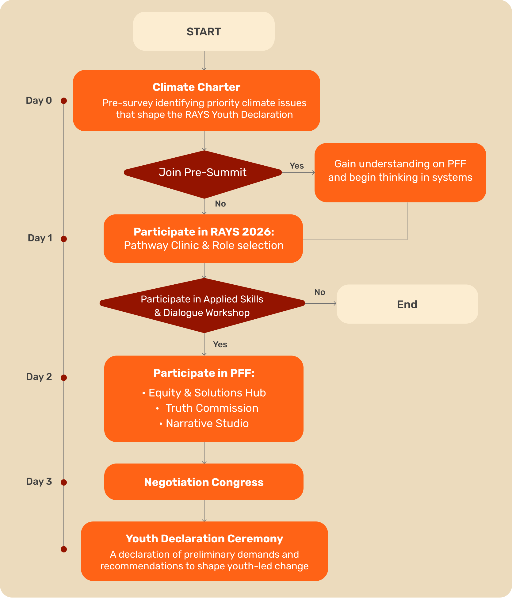 PFF is designed for anyone passionate about climate issues, regardless of background. Through mentorship, applied skills and dialogue workshops, and collaborative sessions, you will gain the knowledge to contribute meaningfully towards the RAYS Youth Declaration. No prior experience is needed.